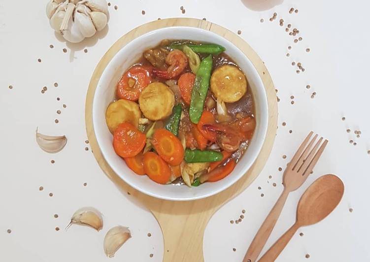 - Tambahkan kapri,egg tofu,aduk perlahan,kentalkan dg larutan tepung sagu,aduk sampai kental