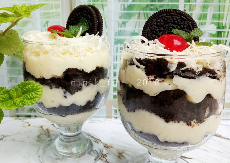- Hancurkan biskuit oreo lalu tata dalam gelas berselang seling dg vla. Hias dg potongan oreo dan keju. Simpan dalam freezer. Setelah beberapa jam siap sajikan.