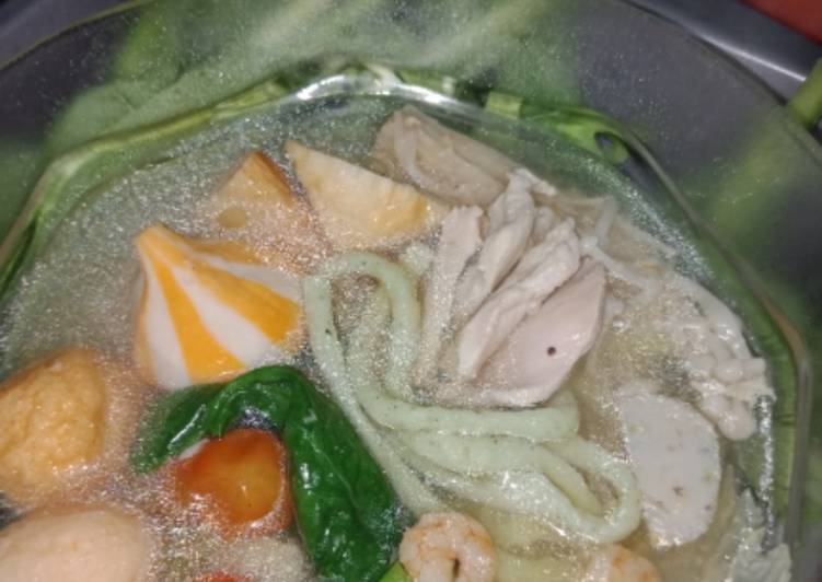 - Masukkan sayuran dan bahan steamboat, jamur enoki aduk-aduk. Angkat, segera sajikan