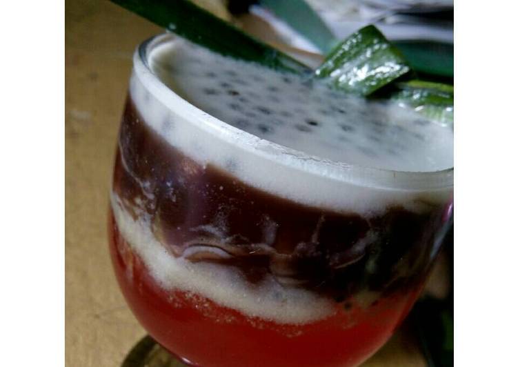 - Masak nutrijel rasa strawberry sesuai petunjuk dalam kemasan, setelah masak taruh dan dinginkan dalam gelas dan tuangkan satu sendok selasih diatasnya. Setelah dingin, masak lagi nutrijel rasa cokelas dengan cara yg sama, dan tuang di atas nutrijel strawberry. Dinginkan.