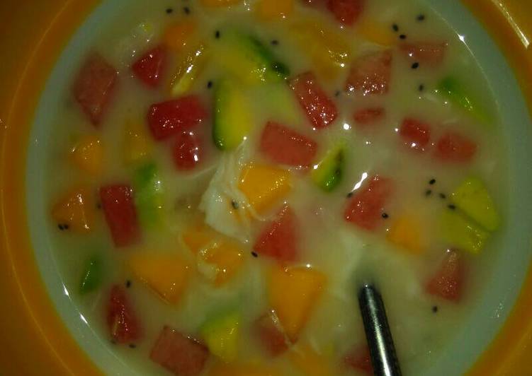 - Tambahkan kelapa, semangka, alpukat, mangga, nangka, dan selasih, aduk rata